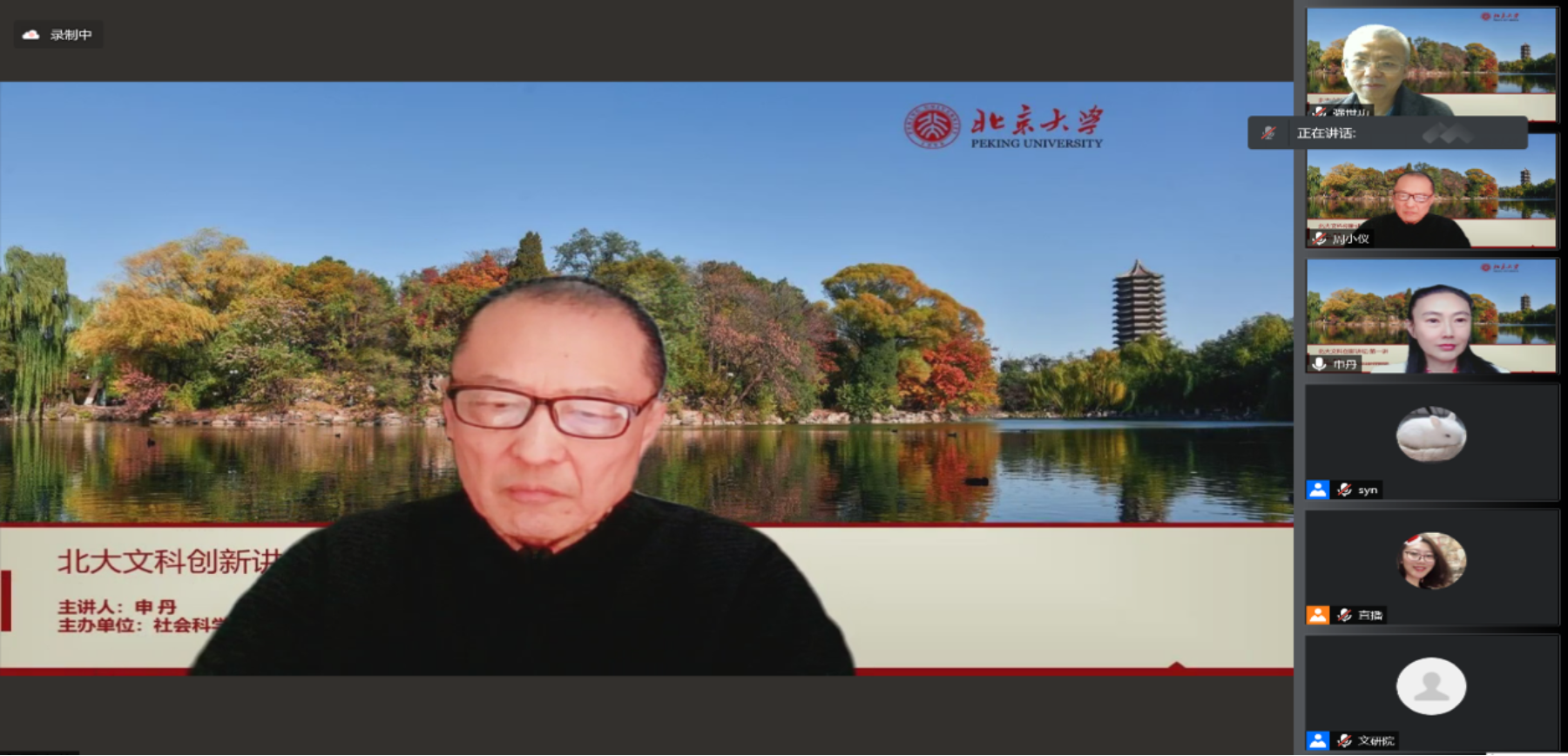 2021年10月29日下午,“北大文科创新讲坛”第一讲举行。讲坛讨论主题为文学叙事中的“隐性进程”与双重叙事进程理论,主讲人为该理论的发明者北京大学外国语学院博雅讲席教授、人文学部主任申丹。北京大学副校长王博作视频致辞。北京外国语大学外国文学研究所所长姜红教授和北京大学外国语学院周小仪教授担任评议人。出于疫情防控的需要,讲坛采用腾讯会议线上直播的方式进行,在线观众1700余人。讲坛由北京大学社会科学部和人文社科研究院联合主办,社会科学部部长强世功教授主持。