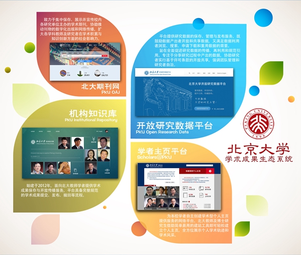 2月25日,由校内多个院系及管理部门合作参与,并由图书馆承建的北京大学学术成果生态系统四大平台——北京大学机构知识库3.0版、北京大学期刊网2.0版、北京大学开放研究数据平台测试版和北京大学学者主页测试版——同时上线。四大平台的上线,标志着北京大学面向机构和学者的学术成果生态系统第一阶段建设任务的完成。