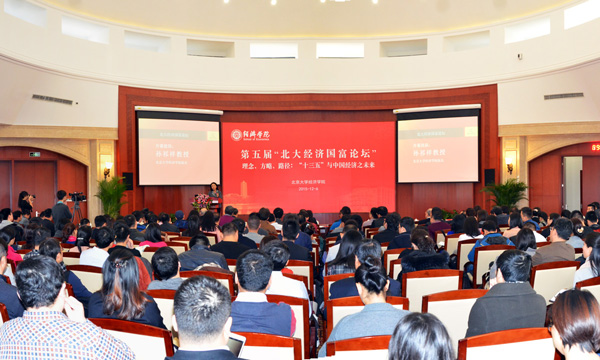 北京大学经济学院年度学术盛会,第五届“北大经济国富论坛”于2015年12月6日在北京大学经济学院东旭学术报告厅举行。“北大经济国富论坛”是集学术界、产业界、政界一体的思想阵地,是北京大学经济学院开展学术讨论的品牌论坛,此次论坛的主题为:“理念、方略、路径:‘十三五’与中国经济之未来”。论坛演讲嘉宾主要有:原国家外经贸部副部长、博鳌亚洲论坛原理事、秘书长龙永图,中国社会科学院学部委员、中国社会科学院原副院长李扬,“十三五”国家发展规划专家委员会委员、财政部财政科学研究所原所长贾康,北京大学经济学院顾问委员会委员、香港执业资深大律师梁定邦,北京大学经济学院国际经济与贸易系主任王跃生。论坛由北京大学经济学院党委书记、副院长章政主持,来自政府、学界、产业界、媒体的代表、在校学生以及校友等300余人出席了论坛。