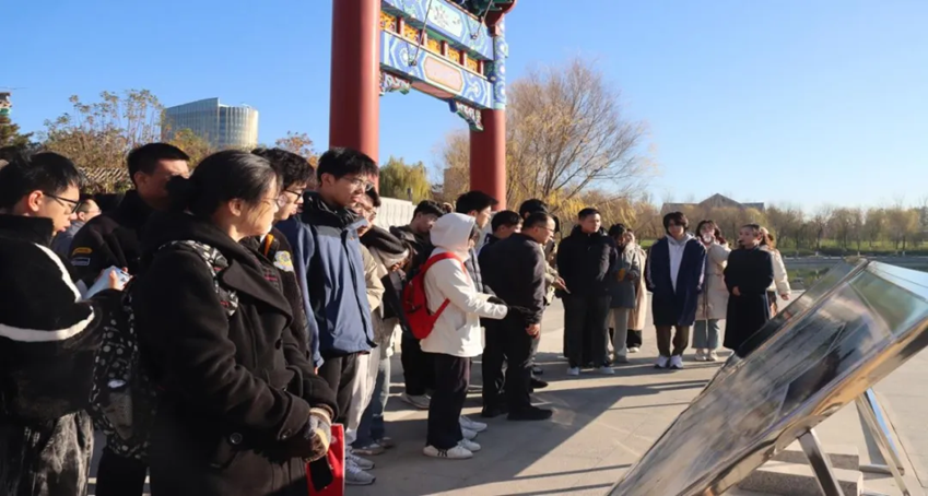 上午,北大师生一行在讲解员的陪同下首先来到金湖公园。初冬的雄安天容澄清,师生们登上定安阁,远眺容东片区建设风貌。视线前方,“惠泽千秋”四个烫金大字与更远处“高标准高质量建设雄安新区”的红色标语遥相呼应,显现出对雄安新区建设的决心与期待。