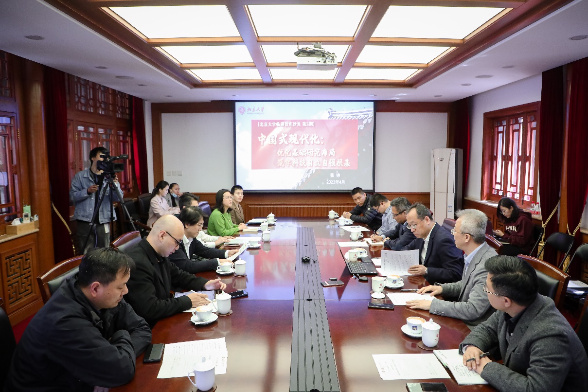 “临湖智库沙龙”由社会科学部主办,人事部、国际合作部、融媒体中心协办,旨在学习贯彻落实党的二十大精神,推进构建哲学社会科学自主知识体系,提升咨政服务能力,营造良好的智库研究氛围,加快凝聚北大智库共同体。本次沙龙采取线下线上结合的形式举行,来自新结构经济学研究院、数学科学学院、计算机学院、地球与空间科学学院、化学与分子工程学院、医学部、材料科学与工程学院、生命科学学院、中国教育财政科学研究所等院系单位的学者到场研讨,北京大学出版社、科学研究部、人事部、社会科学部等职能部门人员参会,600多名校内师生在线参加。
