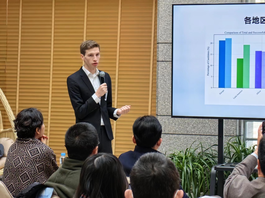 燕京学堂2022级硕士生Mika Erik Moeser具体介绍了专家数据库初步的分析结果。他通过可视化图表呈现了年龄、性别、国籍、地区、教育背景、语言能力对候选人入选成功率的影响。结果显示,中国候选人的入选率较低,可能受到语言掌握水平和以往任职机构的影响。目前当选的专家仍然集中于发达国家的学校与政府组织。候选人院校的集中也对北京大学健全国际组织人才培养机制有所启示。