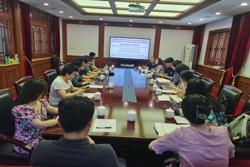 6月6日下午,第二期北京大学“临湖智库国际讲坛”在临湖轩东厅举行。美国加州大学戴维斯分校经济系杰出教授、联合国可持续发展解决方案亚洲区副主席、马来西亚双威大学亚洲办事处主任胡永泰教授以“东盟在国际新常态下维护多边贸易体系的作用”为题作学术报告。