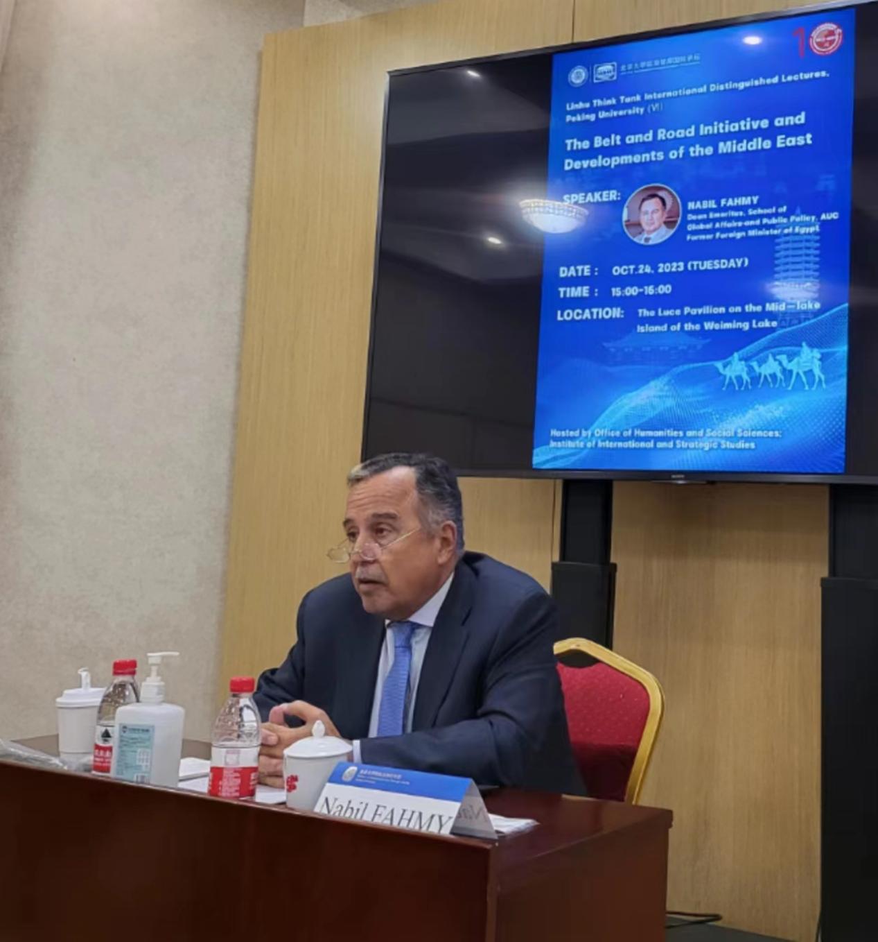 2023年10月24日下午,北京大学“临湖智库国际讲坛”第六期在未名湖湖心岛会议室举行。埃及前外长纳比尔·法赫米(Nabil Fahmy)以“‘一带一路’倡议与中东发展”为题发表了演讲。本次活动由北京大学社会科学部副部长王栋主持。北京大学国际战略研究院院长于铁军、北京大学科学研究部副部长张存群以及校内来自国际关系学院、外国语学院、燕京学堂和区域与国别研究院等多个院系的30余名研究生、博士生参与了此次活动。